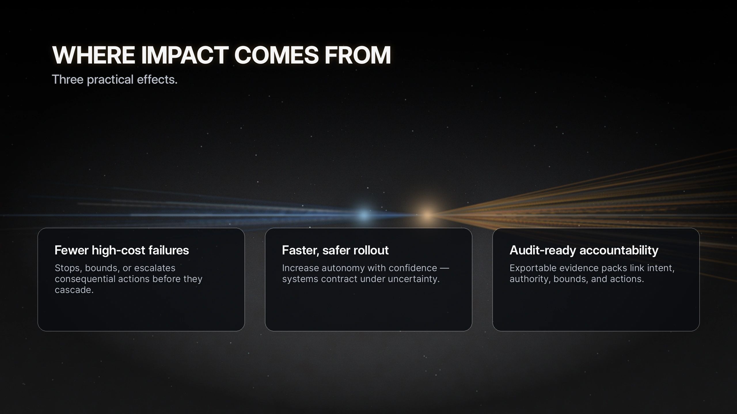 Judgement Spine makes authority, escalation, and safe degradation structural inside the runtime path — so deployment can move forward without losing control. Teams can increase autonomy with confidence because the system contracts under uncertainty instead of pushing ahead.